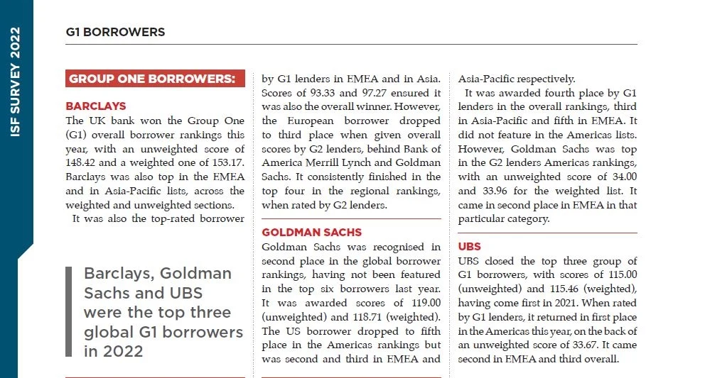 Barclays, Goldman Sachs and UBS were the top three global Group One Borrowers in 2022.